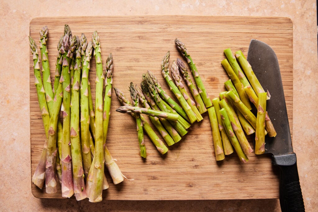 - Wash the asparagus, and trim the tough ends. Chop the spears in half.2 lbs asparagus