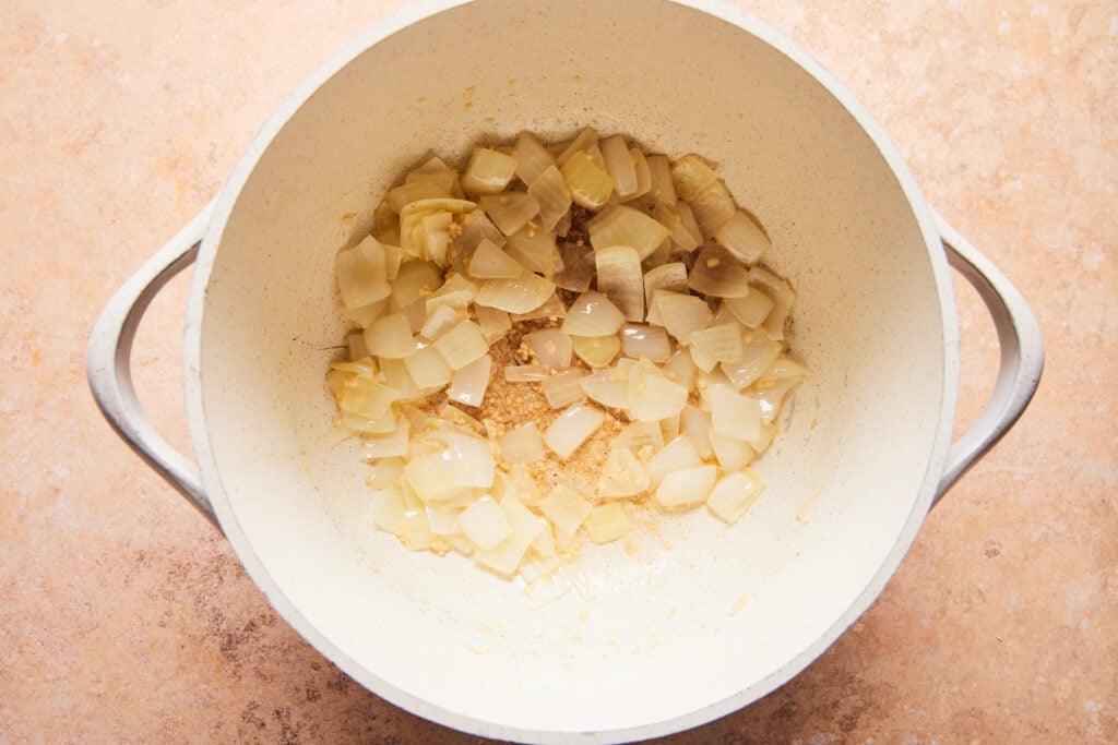 - In a large saucepan, heat butter over medium heat. Add garlic and onion and sauté until soft, about 3-4 minutes.2 tbsp butter, 2 garlic cloves, 1 yellow onion