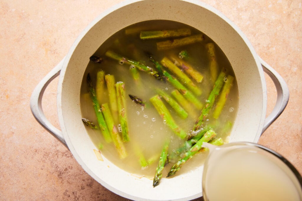 Step 4: Pour in broth, cover, and let it come to a simmer. Turn down the heat to medium low and simmer for 15 minutes until the asparagus is cooked through and soft.