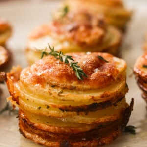 This is one of my favorite ways to eat potatoes. They turn beautifully crisp on the outside and soft inside, with a stacked shape and herby flavor that always feels a little festive. As they roast, garlic-herb butter melts between the slices, seasoning every layer without any extra work. They’re naturally gluten-free, easy enough for weeknights, and special enough for Thanksgiving or any holiday meal.