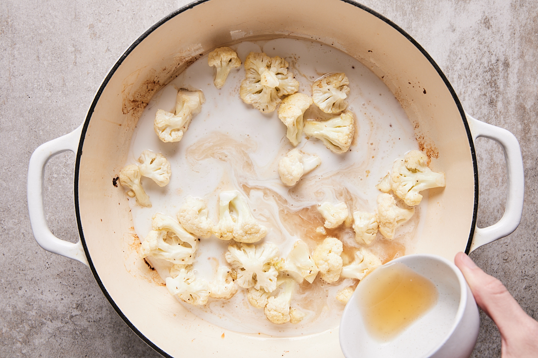 Step 2: Add cauliflower florets to the pan and cook for 2 minutes. Add broth and coconut milk to the pan, cover, and let everything come to a boil. Lower the heat to simmer for 4-5 minutes until the cauliflower is tender.