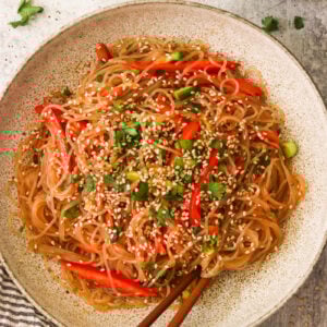 Growing up, sesame-forward dishes were always on the table, and that nutty aroma still feels like comfort to me. If you’ve made my sesame chicken, you know how much I love that deep, toasty sesame flavor. This sesame noodle salad brings that same bold profile in a lighter, fresher way, with silky vermicelli noodles and crisp vegetables tossed in a savory dressing made with toasted sesame oil, rice vinegar, lime juice, and garlic.