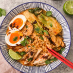 Break up the noodles with chopsticks or tongs. Add baby bok choy and simmer for another 2 minutes covered until softened. You can also add chicken or tofu at this time to heat up in the broth before serving.