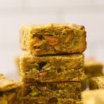 Gently fold in pistachios and/or white chocolate chips, if using. Transfer to the prepared baking dish, flattening out the top. Bake for 25-30 minutes, until light browned on the edges and set in the middle. The middle may seem a bit soft, but it'll firm up as it cools.