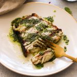 Keyword: 30 minute paleo meals, 30 minute whole30 meals, basil chimichurri suace, chimichurri with basil, grilled halibut recipe, grilled seafood, keto halibut steaks