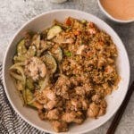 Assemble the chicken, fried rice, and veggies in a bowl. Garnish with sesame seeds, then drizzle with or dip in yum yum sauce. Enjoy! Sesame seeds, Yum yum sauce